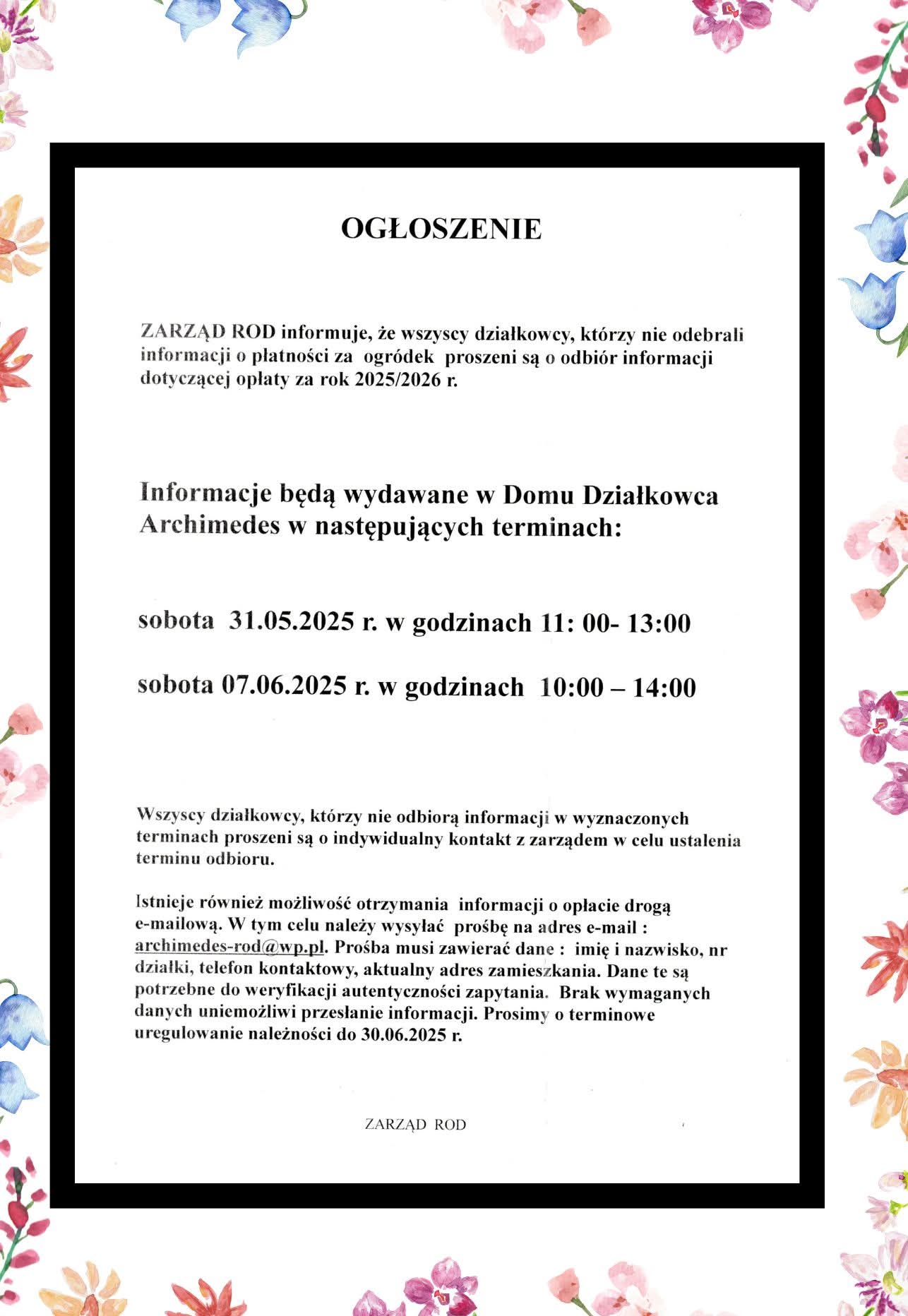 Uwaga: Powyższe naliczenie dotyczy tylko opłat ogrodowych za 2025 rok. Do kwoty wyliczonej należy doliczyć zaległość lub odliczyć nadpłatę za 2024 rok. Szczegóły aktualnego salda każdej działki nie mogą być wywieszone na tablicy ogólnie dostępnej. Zarządzenie PZD w sprawie OCHRONY DANYCH OSOBOWYCH (RODO).